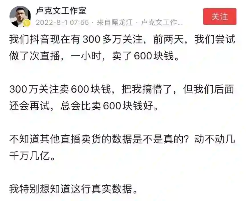 其实不仅是三一博士,在抖音拥有300万粉丝的大V卢克文,直播一小时只卖了600块。