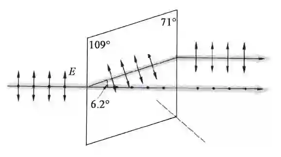 我们是如何发现光波的内部结构呢? 有些特别的晶体,它们会有一种现象称为“双折射”(double refraction). 当你将晶体放在报纸上,你可以看见上面的字有双像(double image)的效果(见图11). 人们对于这种现象一度感到非常疑惑,百思不得其解. 其实,在人们肯定光是波之前,牛顿曾试图用粒子理论来理解双折射现象. 他假设有两种光粒子,所以它们有不同的折射.