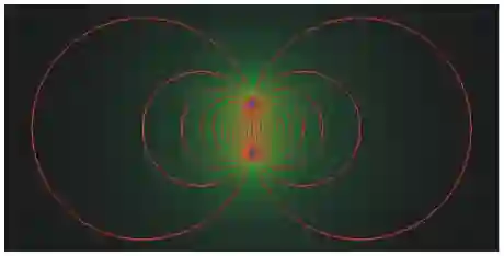 在正电荷和负电荷之间,有很多弦网连接这两个电荷. 在有很多弦网的区域里,有强的电场. 另一个区间里只有较少的弦网,所以只有弱的电场. 假如你学过电磁学或电学便会知道,这不过是两个电荷的电场! 所以,这幅弦网的图画(图25),确实反映了两个电荷周围的电场.