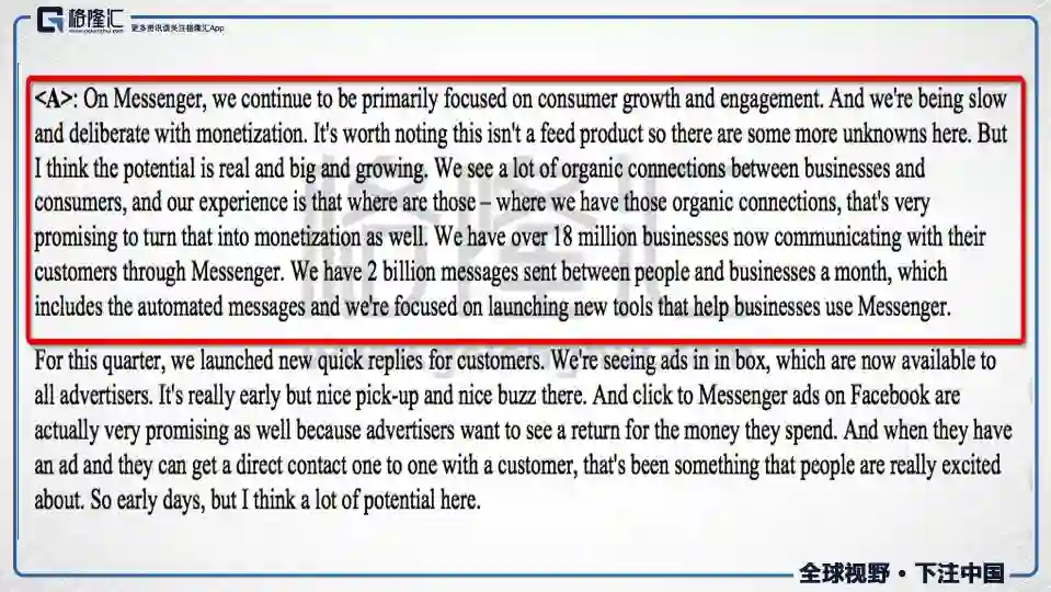 扎克伯格称,Messenger依旧处于获取用户的阶段,货币化程度还是非常低的,但是这个不是一款信息流产品,扎肯伯格认为messenger的未来是非常巨大的,并且还在成长。Messenger正在试图建立用户和商家的一些链接,从而帮助商家更好的使用messenger。