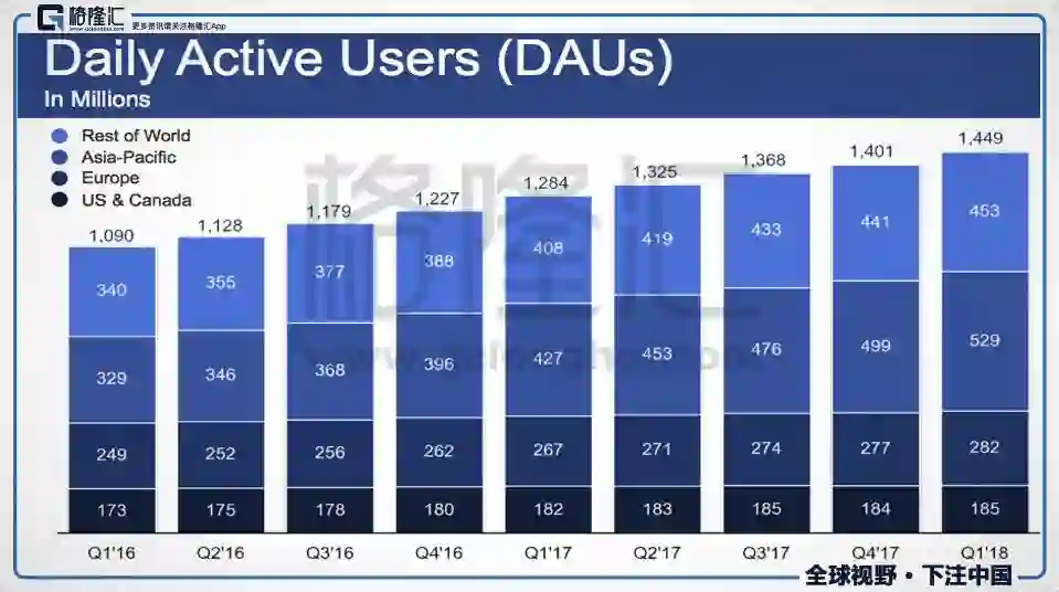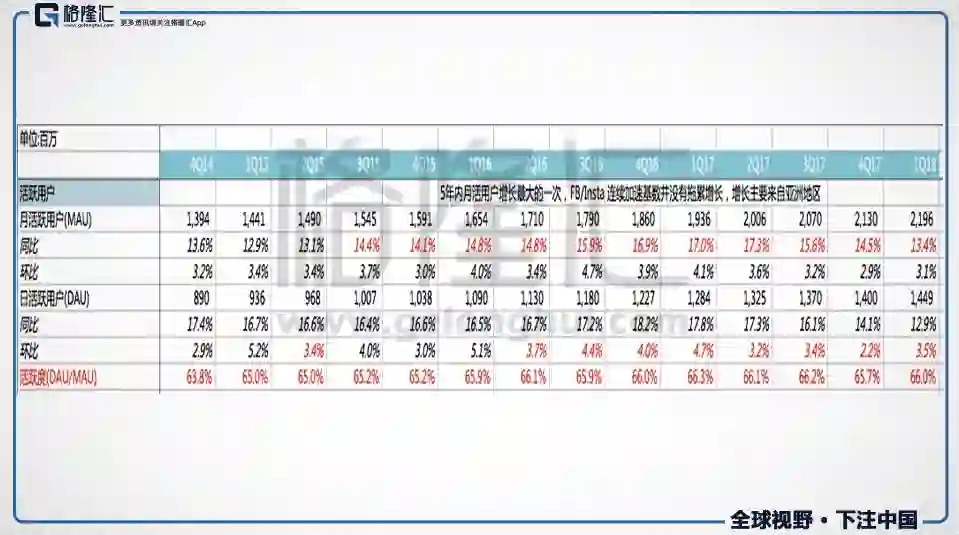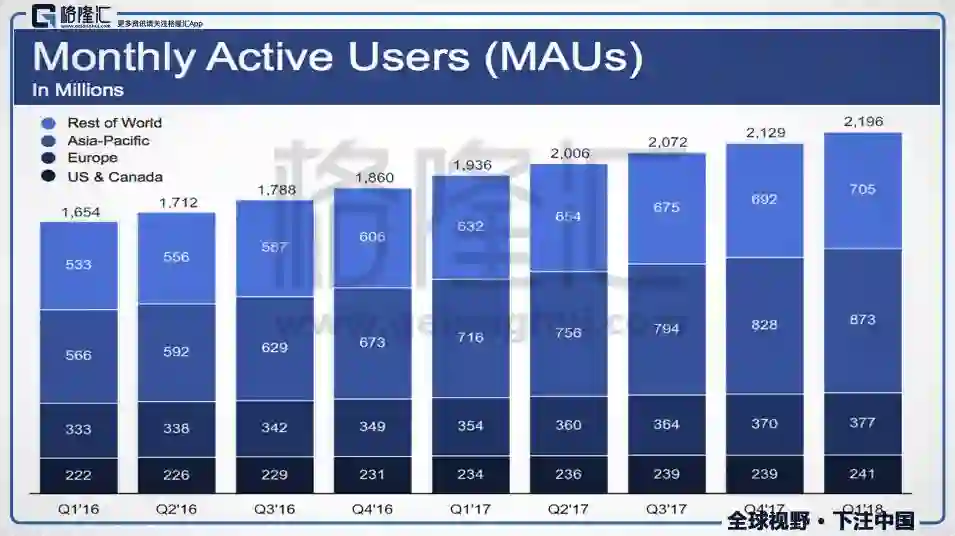 截止到2018年Q1,FB在全球的月活人数21.96亿,日活人数14.49亿。月活环比增长3.1%,同比增长13.4%。日活同意增长12.9%,环比增长3.5%。
