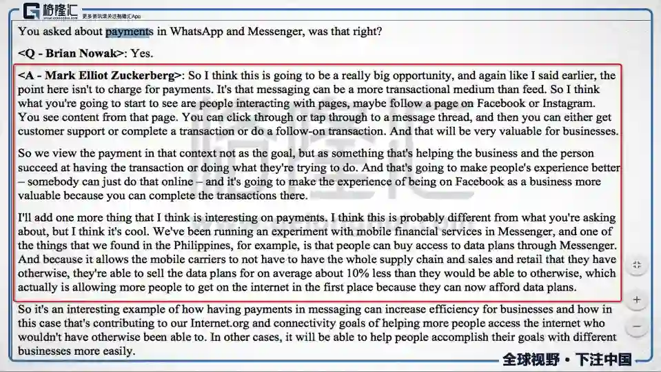 扎克伯格认为whats app和messenger的支付功能将会有巨大的潜力,让用户在FB的产品体系内完成交易,会让FB更有价值。本质上这里做的应该是把服务和人链接起来,下面扎克伯格给了一个例子:在Messenger上正在测试手机金融服务,在菲律宾发生了一个很有意思的事情,就是在messenger上人们可以直接购买data plan(流量套餐),因为手机运行商在messenger出售的套餐没有中间的零售环节,所以平均售价低了10%。