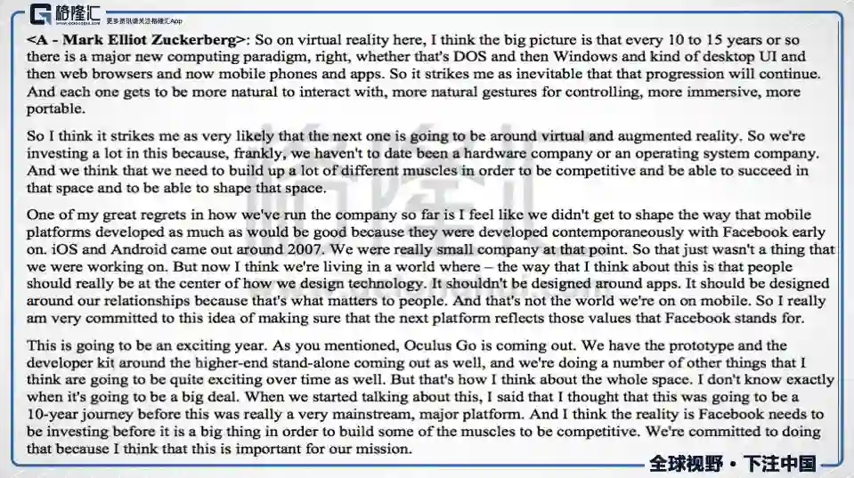 对扎克伯格而言,VR和AR就是移动互联网时代之后的下一个划时代产品,所以FB正在投入大量资金到这里来,但是这不会很快变现,需要很长时间。