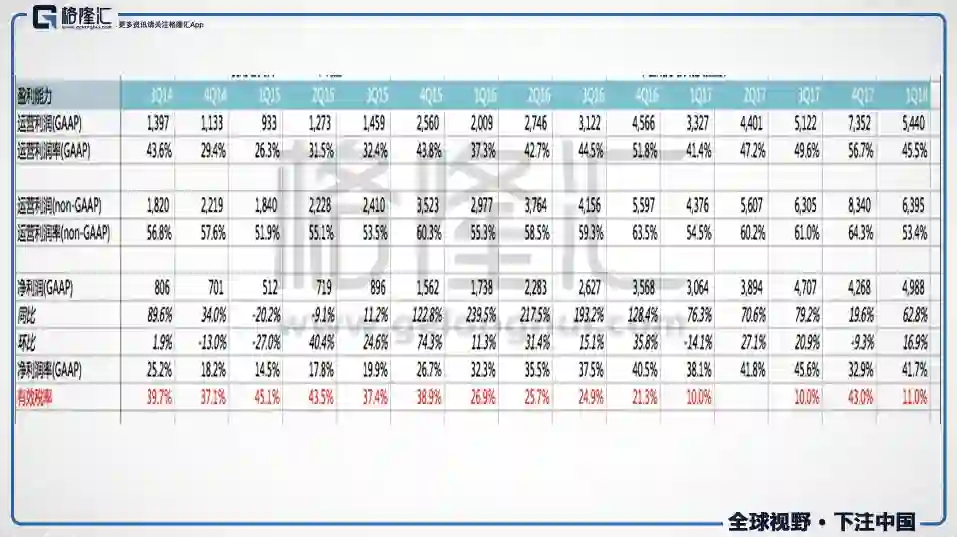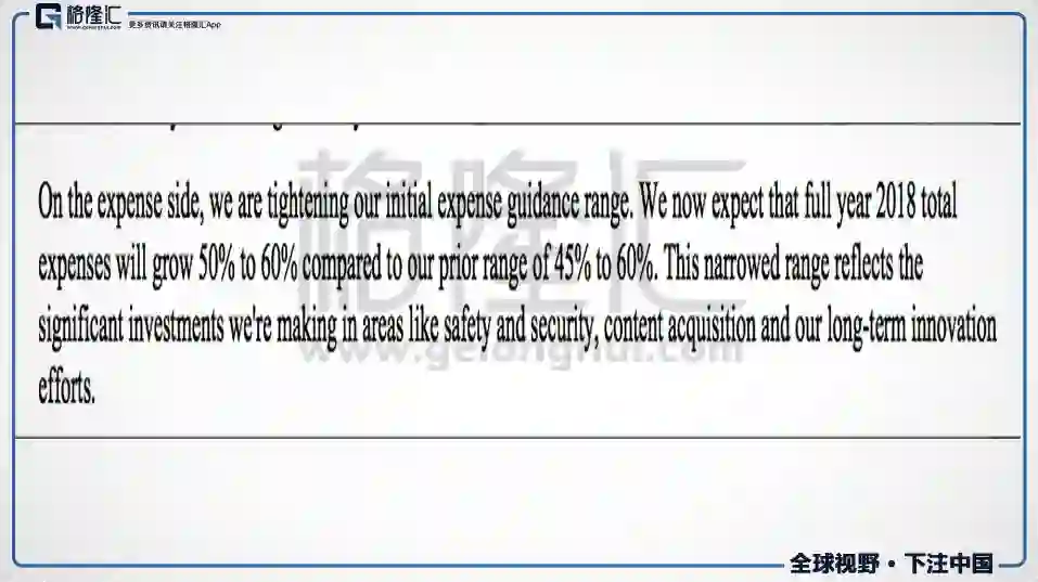 个人观点:收入,eps,运营利润全部beat预期,数据泄露丑闻几乎对业绩毫无影响。值得强调的是,在2017年Q4,管理层预计2018年总的费用上升45%-60%,这个Q的总费用同比上升39%,所以这个季度的费用增幅是大幅度小于市场预期的。但是在电话会议里,管理层称2018年的总费用的guidance从45%-60%,上调到50%-60%,并且强调Q2后费用会加速上升。下图是电话会议里的原文: