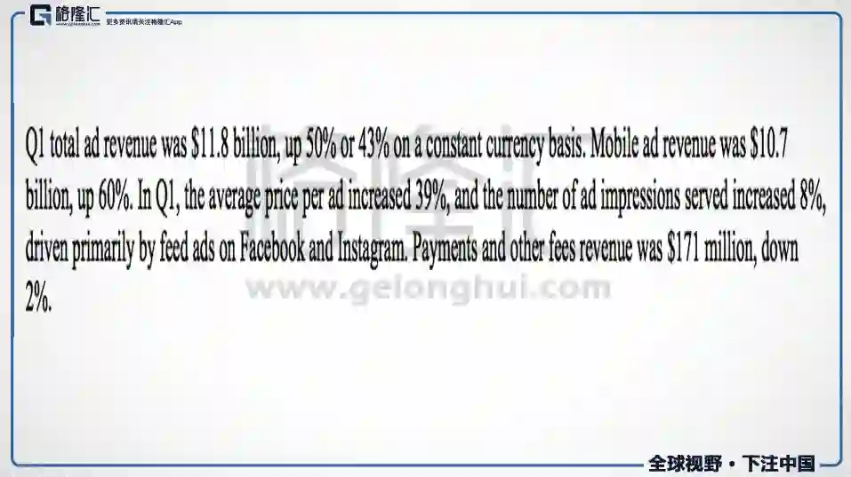 如果细看手机广告增速的话,Q1手机广告收入107亿美金,占比89%,同比增长60%,非常可怕的一个增速。