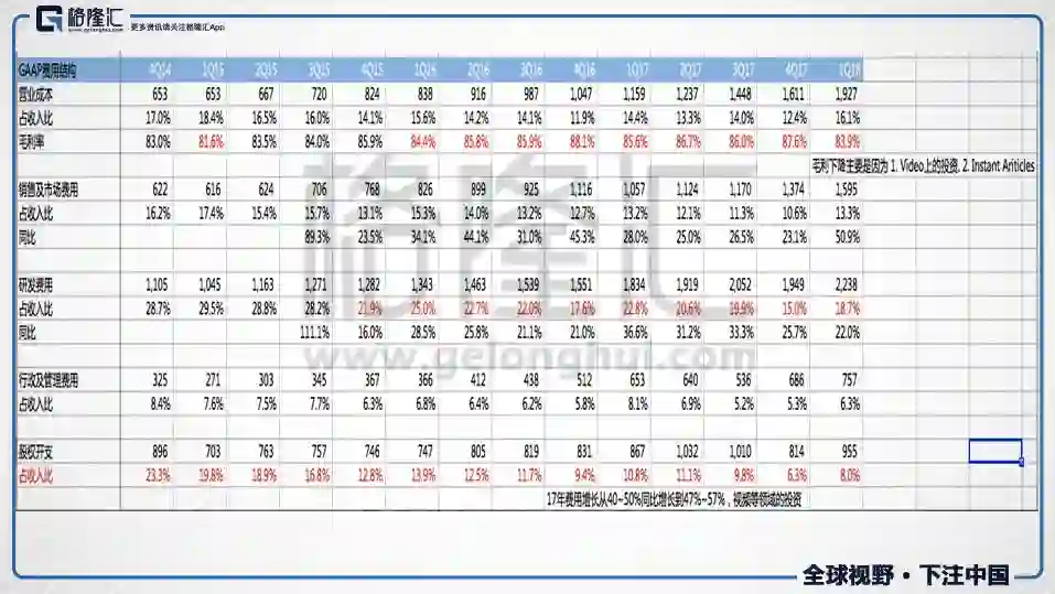 毛利率84%,2017年同期是86%,下降的主要原因有两个:1.Video的内容投资(谷歌的财报里已经有解释为什么记在营业成本里了)2.Instant Articles的会计准则从net accounting,改为gross accounting。
