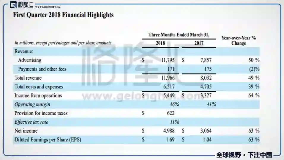 2018年Q1 FB的销售收入是119.66亿美金,销售收入同比增长50%,市场预期114.11亿美金,超预期5%,运营利润54.5亿美金,市场预期49.6亿美金。EPS为1.69美金,预期1.35美金。除此之外,总的费用同比上升39%,Operating Margin 同比上升5%,达到了46%,净利润同比上升63%。