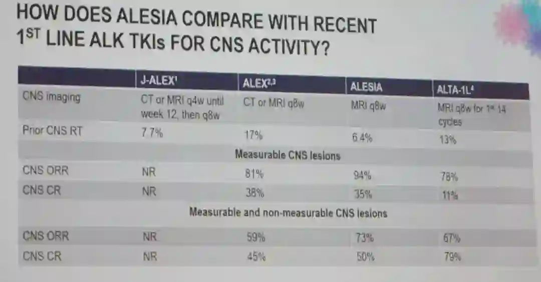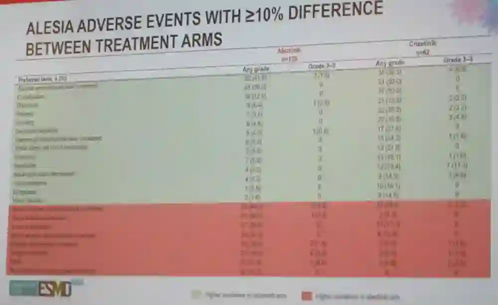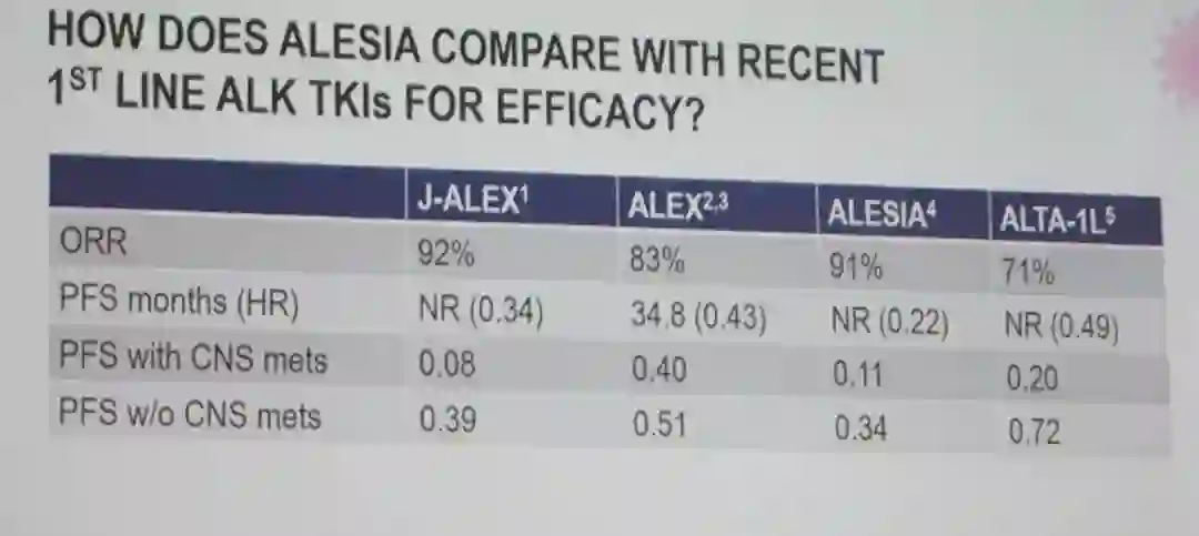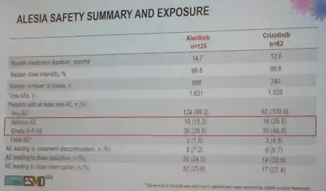 安全性和耐受性分析,阿来替尼在J-ALEX、ALEX和ALESIA研究中显示出一致的安全性,因AE导致治疗中止的患者比例较低。此外,在ALESIA研究中还观察到阿来替尼组可以延缓生活质量恶化时间。