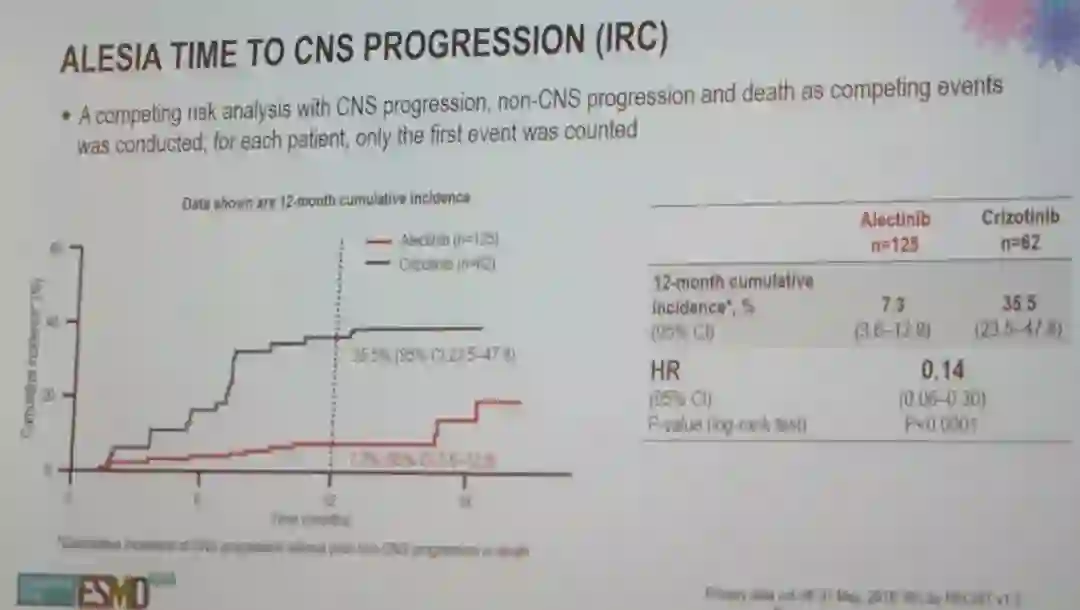 采用竞争性风险分析来评估CNS进展,非CNS进展和死亡作为竞争事件,每例患者仅记录第一次进展事件。结果显示,12个月的累积CNS进展风险,阿来替尼组和克唑替尼组分别为7.3%和35.5%;HR 0.14;95%CI:0.06-0.30;P<0.0001。