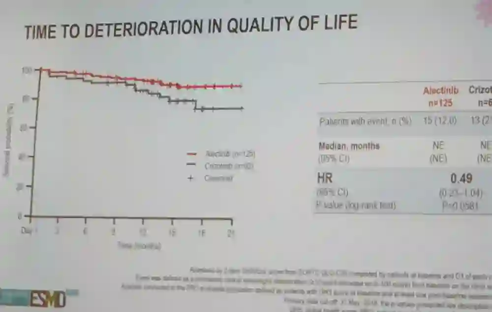 生活质量对比:阿来替尼组对比克唑替尼组可以延长至肺癌症状恶化(HR 0.67 [95% CI 0.38–1.18])和至生活质量恶化时间 (HR 0.48 [95% CI 0.23–1.04])。