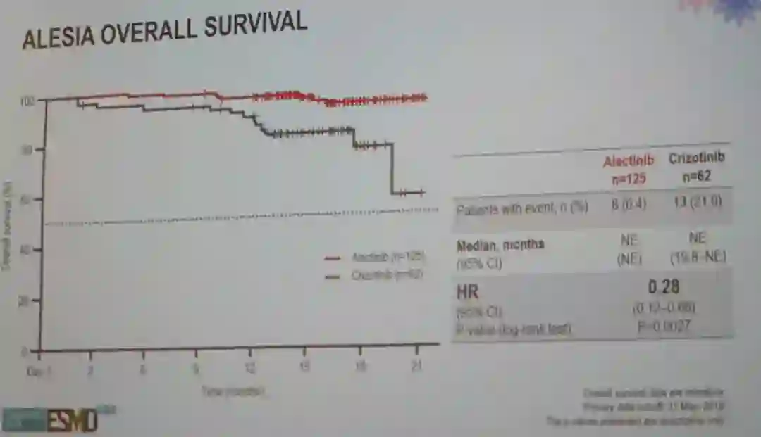 OS数据尚未成熟,两组的mOS均尚未达到,初步研究结果显示,阿来替尼组和克唑替尼组的事件率分别为6.4%和21.0%;阿来替尼组对比克唑替尼组,显著降低患者死亡风险,HR 0.28 (95% CI 0.12–0.68);p = 0.0027。