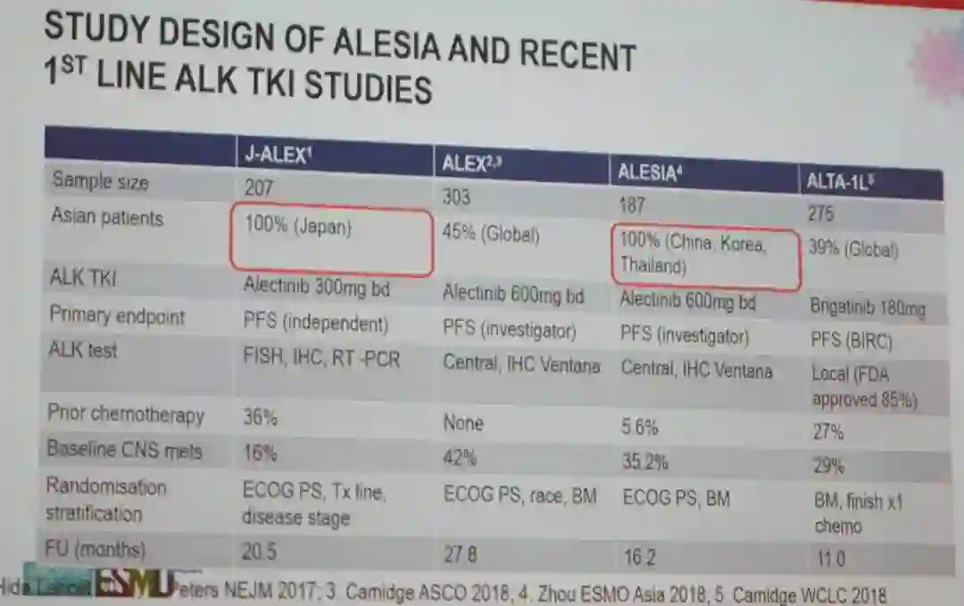 汇总分析近期进行的一线一代 vs 二代ALK TKI头对头对比的研究,J-ALEX研究和ALESIA研究均是在亚裔患者中进行,分别覆盖了日本人群和中国、韩国、泰国人群。在入组人群的基线CNS转移患者比例、分层因素等因素对比上,仍存在一定差异。