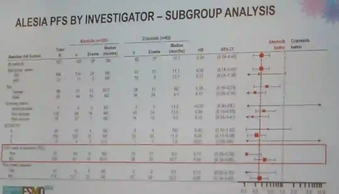 ALESIA研究达到主要终点,两组的PFS曲线从最初开始分开,阿来替尼组显著降低患者的疾病进展或死亡风险;HR 0.22。这一研究结果与J-ALEX研究类似,在J-ALEX研究中,也观察到阿来替尼显著的优势,两组PFS曲线从最初开始分开,HR为0.34,各个亚组观察到一致的PFS获益。CNS疗效分析中,4个一代 vs 二代ALK TKI的研究均一致显示,二代ALK TKI显著更优的CNS活性。