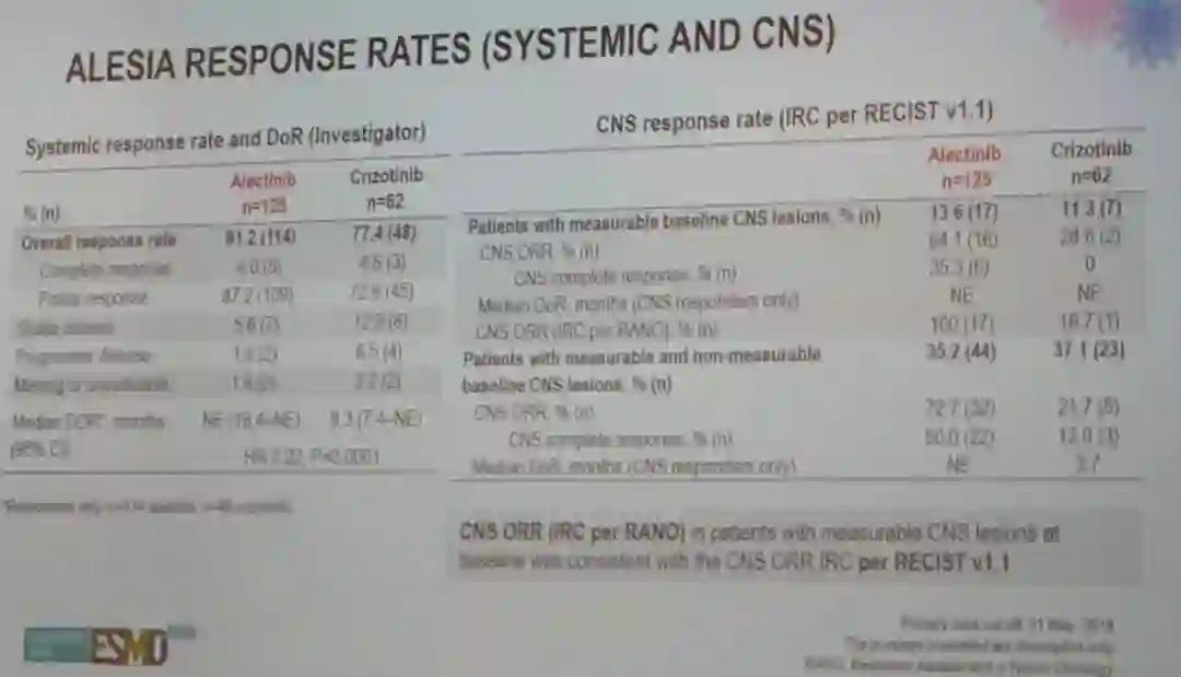 系统性和CNS客观缓解率分析:系统性ORR,阿来替尼组和克唑替尼组分别为91.2% vs 77.4%;中位DOR分别为尚未达到和9.3个月;HR 0.22;P<0.0001。CNS ORR分析,在基线合并可测量脑转移的患者中,阿来替尼组和克唑替尼组分别为94.1% vs 28.6%;在基线合并可测量或不可测量脑转移患者中,两组的ORR分别为72.7% vs 21.7%;中位DOR分别为尚未达到和3.7个月。