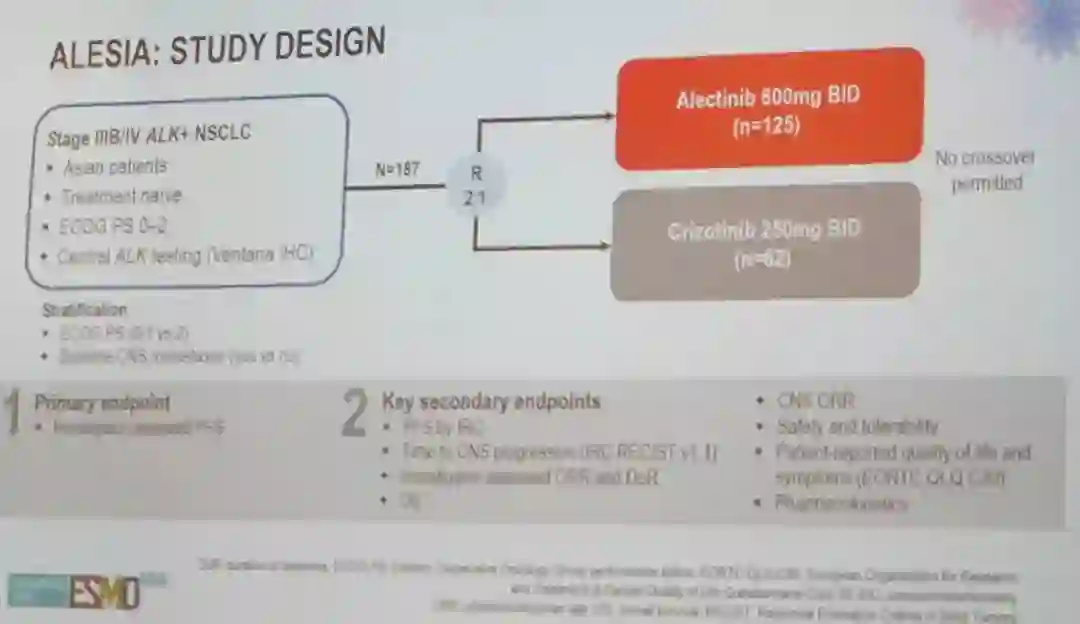 对于ALK+的NSCLC患者,易发生CNS转移,发生率达到24%-42%;5年的累积发生风险增加到73%。此外,接受克唑替尼治疗后的患者,CNS也是常见的进展部位,基线合并CNS转移的患者,出现新发CNS转移灶或CNS进展发生率达到70%;基线未合并CNS转移的患者,CNS进展率为20%。因此,新一代ALK TKI的开发围绕着降低CNS进展风险为主。与ALEX研究一致,ALESIA研究设计相似,也是采用中心实验室IHC检测筛选患者,主要研究目的为进一步在亚裔患者中验证阿来替尼的疗效。