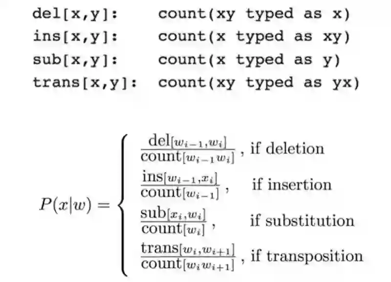 其中 p(x|w) 是正确的词编辑成为错误词 x 的转移概率,p(w) 是正确词的概率,p(x) 是错误词的概率。