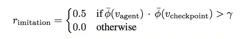 φ函数表示投影函数,这个Reward设计的意思是,如果Agent在执行Action后得到的结果状态φ(agent),与模仿序列中的某个状态足够相似,则获得奖励。checkpoint是模仿序列的一个时间指针,表示当前到达模仿序列哪一个位置了。如果Agent的结果状态与序列第 (checkpoint + i)个位置的状态最相近,且相近程度大于阈值γ,那么就给与Agent奖励,并将新的checkpoint设置为 (checkpoint + i)。这样就结合强化学习实现了模仿学习。