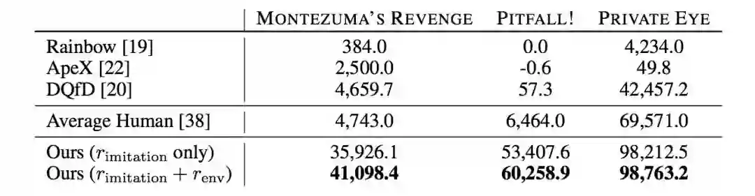 为了更好地探索游戏环境,作者在模仿学习的奖励的基础上,也加入了游戏环境本身得分Reward,这样能得到更好的性能,实验结果如下表: