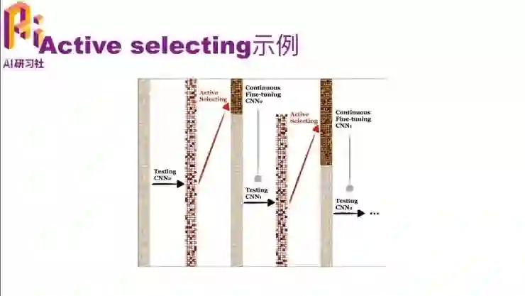 刚才的文字讲解可能不是很直观,我们用一个图来看一下。这个图从左到右看,一开始灰蒙蒙的意思是都还没有标注,然后用一个pre-trained model去预测一遍都是哪个类。这样每个数据上都有一个概率,可以根据这个概率去选择它是不是难分的那个数据,就得到了中间这个图,上面那一段是比较难的,然后我们把它标注出来。然后用一个 continuous fine-tune 的 CNN,就是在原来的模型上再做一次 fine-tune,因为有了一些标注数据了嘛,就可以继续 fine-tune了。 fine-tune后的模型对未标注的数据又有了一个预测的值,再根据这些预测值与找哪些是难标的,把它们标上。然后把这些标注的数据和之前就标注好的数据一起,再做一次 continuous fine-tune,就得到 CNN2了。然后依次类推,直到把所有的数据都标完了,或者是在没有标完的时候模型的效果就已经很好了,因为把其中难的数据都已经标完了。