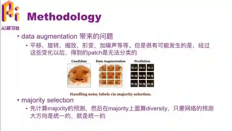 所以这种时候做一个 majority selection,就是一个少数服从多数的方式,因为多数都识别出来它是一只猫了。这就是看它的倾向性,用里面的6个预测值为0.9的数据,上面三个预测值为0.1的就不作为增强后的结果了。这样网络预测的大方向就是统一的了。