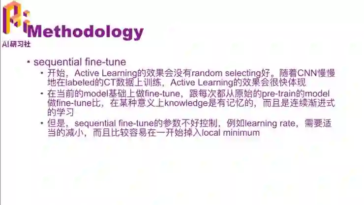 这篇文章的创新点除了active learning之外,它在学习的时候也不是从batch开始,而是sequential learning。它在开始的时候效果就不会特别好,因为完全没有标注数据,它是从一个ImageNet数据库训练出的模型直接拿到medical的应用里来预测,效果应该不会太好。然后随着标注数据的增加,active learning的效果就会慢慢体现出来。这里是在每一次fine-tune的时候,都是在当前的模型基础上的进一步fine-tune,而不是都从原始的pre-train的model做fine-tune,这样就对上一次的模型参数有一点记忆性,是连续的学习。这种思路就跟学术上常见的sequntial learning和online learning是类似的。但是有一个缺点就是,fine-tune的参数不太好控制,有一些超参数,比如learning rate还有一些其它的,其实是需要随着模型的变化而变化的,而且比较容易一开始就掉入local minimal,因为一开始的时候标注数据不是很多,模型有可能学到一个不好的结果。那么这就是一个open的问题,可以从好几个方面去解决,不过解决方法这篇文章中并没有提。