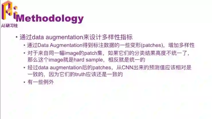 刚才提到了两个指标来判定一个数据是不是难分的数据。entropy比较直观,预测结果在0.5左右就认为它是比较难分的;但diversity这个值不是很好刻画,就通过 data augmentation数据增强的方式来设计指标,就是说从一个图像设计出一系列它的变形。这些变形就可以是靠翻转、旋转、平移操作等等,一个变成了好几个甚至十几个,增加了它的多样性。然后对这些所有的变形去预测它们的分类结果,如果结果不统一的话,就说明这副图像的diversity比较强,那么这张图像就是比较难分的,是hard sample;反之就是比较好分的,那么就不去做它的增强了。然后对所有增强以后的数据的预测值应当是一致的,因为它们代表的是同一个东西,但是也有一些例外,如果是像我刚才说的那样的简单的数据增强。