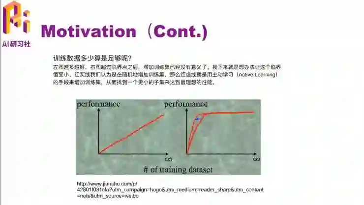 那我们就要考虑要多少训练数据才够训练一个 promising 的分类器呢?这里有个例子,比如左边这个图,这个模型的 performance 随着数据的增加是一个线性增长的过程,就是说数据越多,它的 performance 就越高。但在实际中,这种情况很少出现,一般情况下都是数据量达到一定程度,它的 performance就会达到一个瓶颈,就不会随着训练数据的增加而增加了。但是我们有时候想的是把这个临界点提前一点,让它发生在更小数据量的时候。比如右边这个图的红色虚线部分,用更小的数据达到了相同的 performance。这篇论文里就是介绍主动学习 active learning 的手段,找到一个小数据集达到大数据集一样的效果。