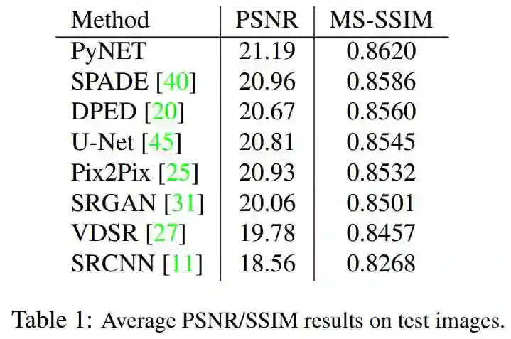 研究者针对 PyNET 和其他深度学习方法进行了定量评估,其 PSNR(峰值信噪比)和 MS-SSIM 结果如上。可以看出 PyNET 在两项指标上都高于其他深度学习模型。