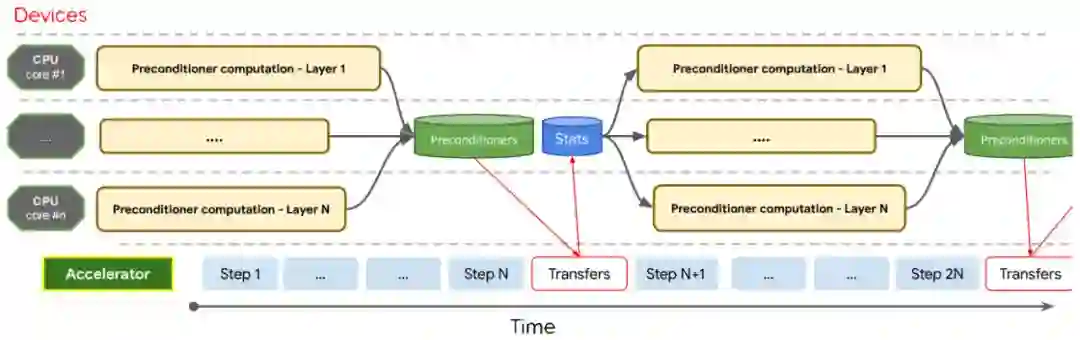 本文优化算法设计的时间轴。在每一步上计算所有张量的预调节器统计数据。预调节器只在每 N 步上计算,并且计算会分配给训练系统上可用的所有 CPU 核心。运算进行流水线处理,这样就实现了开销均摊。