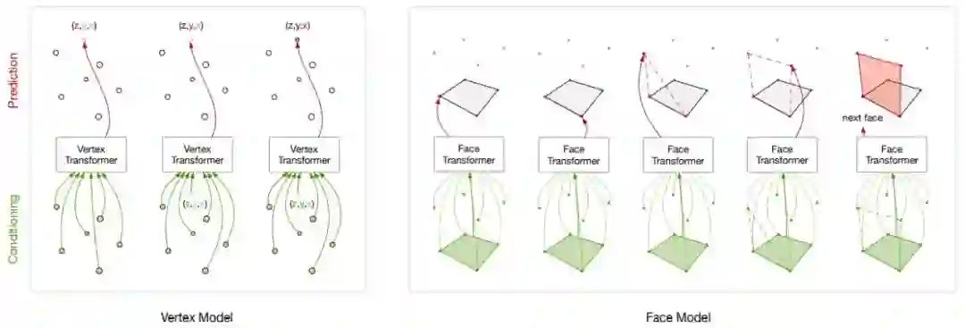为了生成下个顶点,当前序列的顶点坐标作为语境传递给下个顶点 Transformer,它又为下个顶点坐标输出一个预测分布。