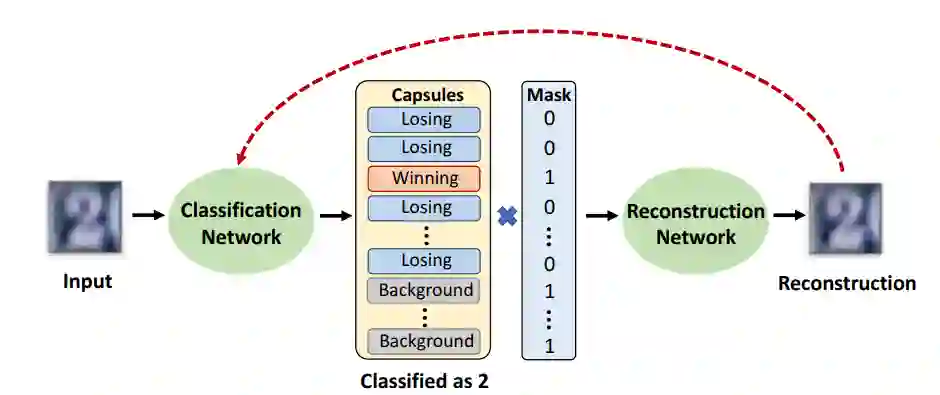 ,它可以精确地检测到攻击,对于未检测到的攻击,它通常也可以迫使攻击者生成类似于目标类的图像(从而使它们偏转)。该网络结构由两部分组成:对输入进行分类的胶囊分类网络,以及根据预测的胶囊的姿态参数重建输入图像的重建网络。