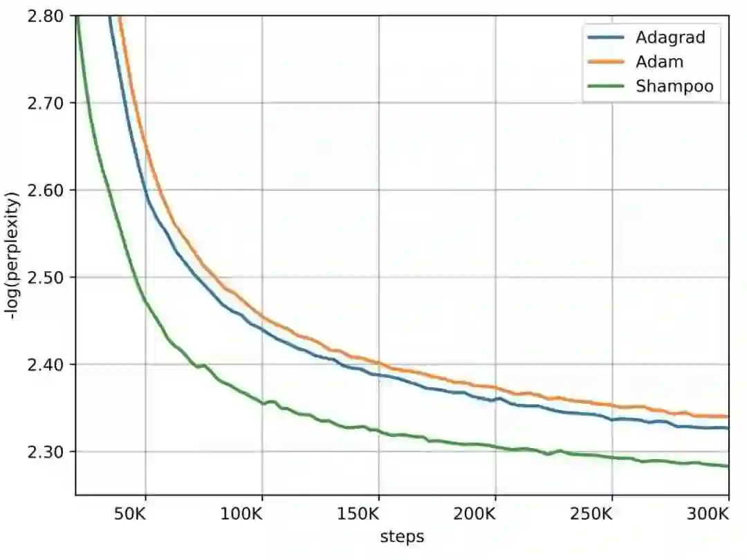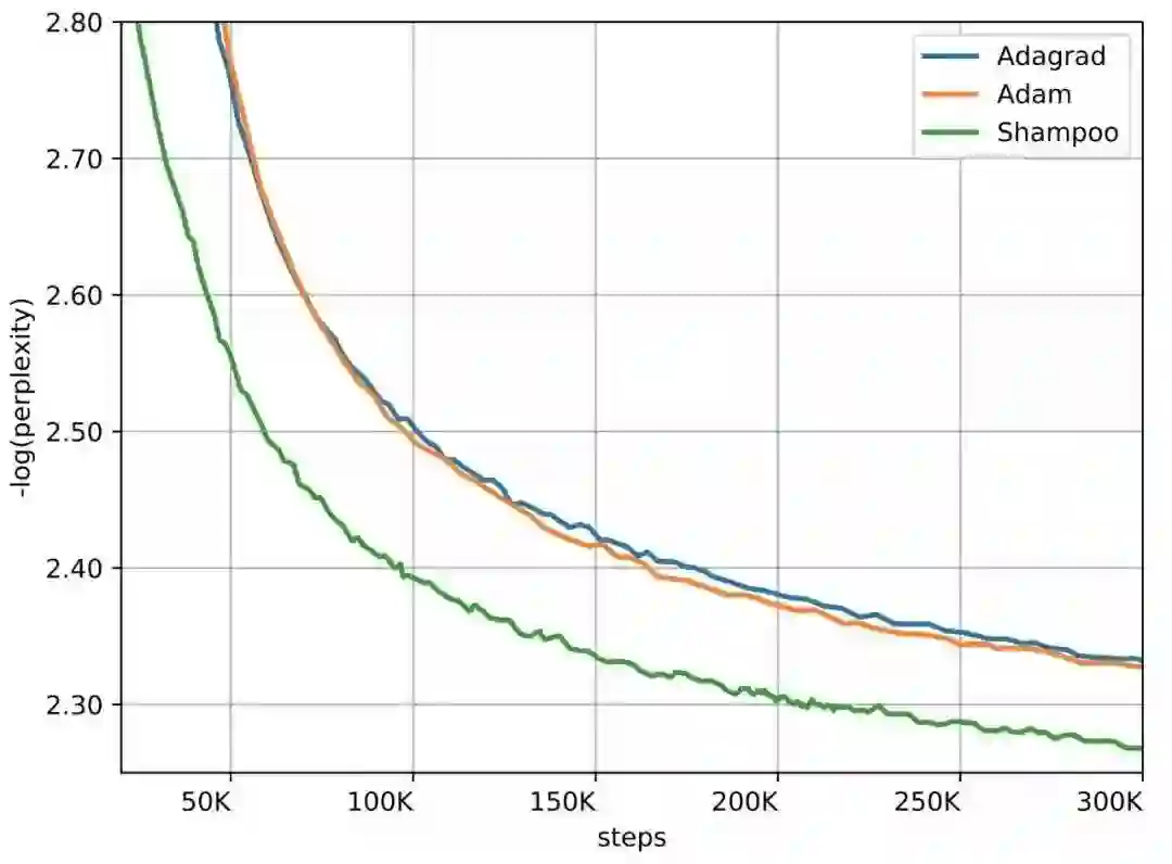 WMT'14 英法翻译数据集上的 Transformer-Big 模型,Shampoo 二阶梯度算法的收敛速度在迭代数上快了 2 倍,且就算要计算二阶梯度,每一次迭代也只慢了 40%,总体上来说节省了 30% 的执行时间。