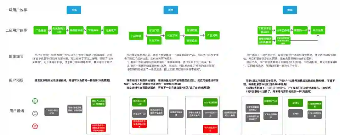 基于瑞幸咖啡的例子,我们尝试使用“用户体验地图”来更全面地了解产品/服务在各节点的用户满意度。