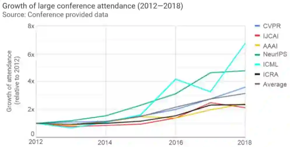 在大型会议中,NeurIPS (曾用名NIPS) 、CVPR和ICML,是参与人数最多的三大AI会议。自2012年以来,参与人数的增长率,这三者也领先于其他会议。值得一提的是,ICML在2018年一年的时间增长了将近一倍。