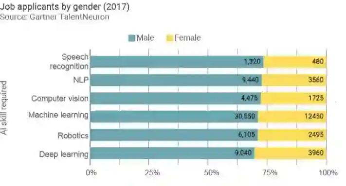 人工智能相关岗位的性别差距依然严重。上图的显示按照技能分类,各个技能之间有相关性。申请人的数目并不代表雇佣人数,但总体而言,在美国,男性占人工智能相关职位申请申请人数的71%。在人工智能各个子学科之间,深度学习和机器人学对比其他学科,性别比例相对平衡。