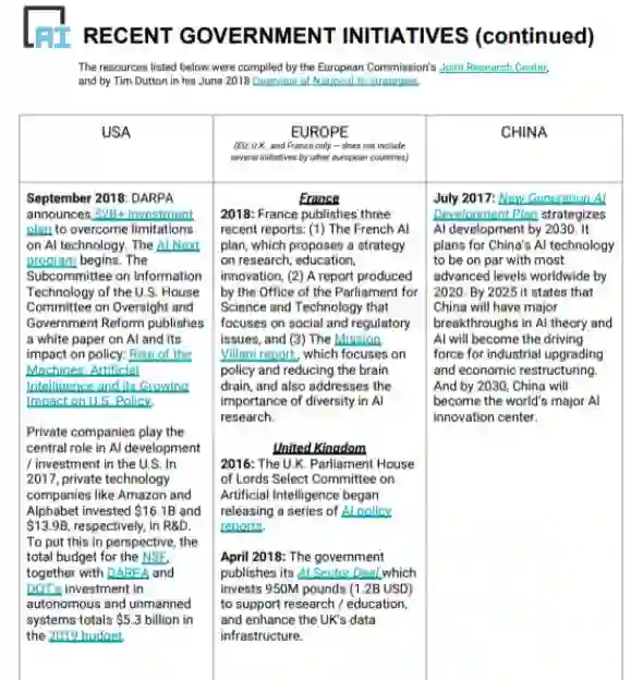 在欧盟地区,法国最近发表了三份报告:(1)法国Al计划,其中提出了一项关于AI研究、教育、创新的战略;(2)编写了一份侧重于社会和监管问题的报告;(3)《 Mission Villani report》,该报告侧重于政策和减少人才外流,并阐述了多样性在AI研究中的重要性。英国从2016年开始发布一系列的