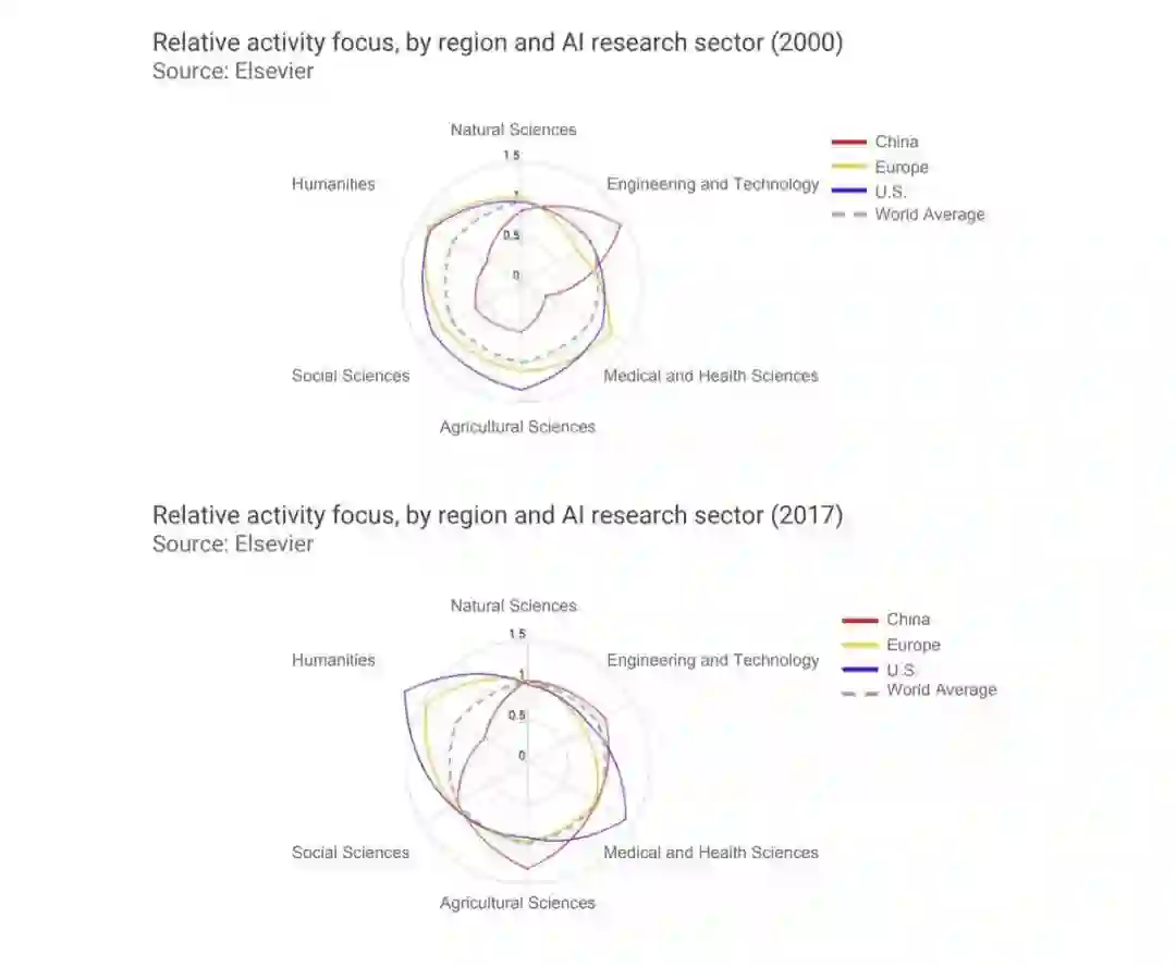 从报告中可以看出,各国对人工智能应用方向重视不同。中国非常重视农业科学,工程和技术方面的应用,相比于2000年,2017年,中国加大了对农业方面的重视。而欧洲和北美非常看重人文学科以及医疗方面的应用,欧洲的研究方法更为全面。