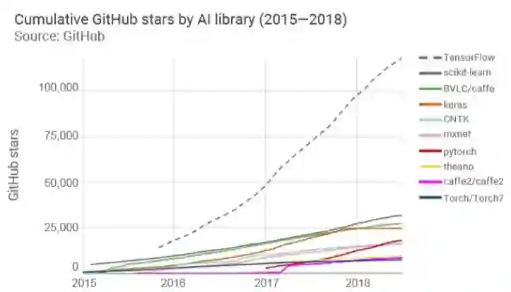 上图显示了各种Al和ML软件包在GitHub上的受欢迎比率,从获星标数量可以大致哪种AI框架最受欢迎。从2015年到2018年,Tensoflow一直占据第一,scikit-learn一直占据着第二的位置。