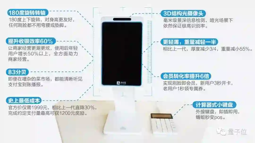 支付宝生物识别负责人留招介绍,蜻蜓2代厚度只有上一代蜻蜓的一半,重量轻一半,带有灵活底座,即插即用,可以让商户根据收银台结构做定制化接入。