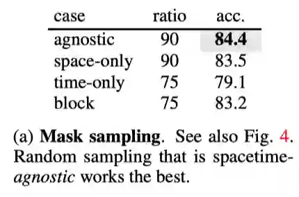 时空不可知采样可以比结构感知采样策略更有效。如上图b和c所示,仅空间或仅时间采样可能保留较少的信息,并产生非常困难的预训练任务。例如,掩蔽率为87.5%的8帧仅进行时间采样意味着只保留一帧,这就提出了一项非常具有挑战性的任务,即仅在给定一帧的情况下预测未来和过去。作者观察到,结构感知采样的最佳掩蔽比通常较低。相比之下,时空不可知采样更好地利用了有限数量的可见patch,因此允许使用更高的掩蔽率。