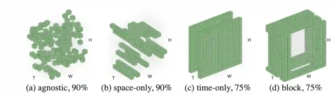 作者从嵌入的patch集中随机抽取patch。这种随机抽样与时空结构无关,如上图a。这种结构不可知的采样策略类似于1D中的BERT和2D中的MAE。