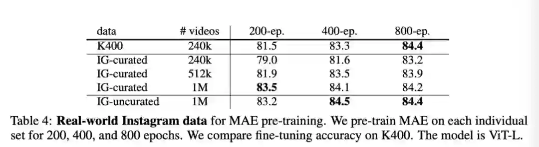 上表展示了用于MAE预训练的真实Instagram数据。作者对每一组MAE进行200、400和800个epoch的预训练,并比较了K400上的微调精度。模型为ViT-L。