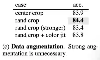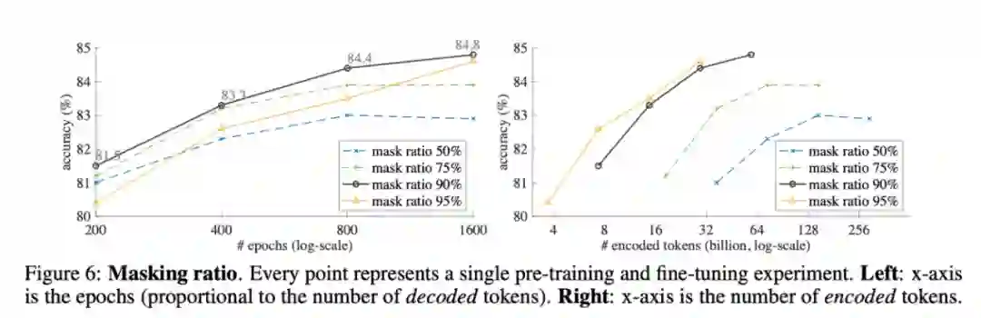 上图显示了掩蔽率与预训练周期的联合影响。90%的比例效果最好。95%的比例表现得出奇地好,如果训练足够长的时间,这可以会赶上。较高的掩蔽率导致编码器编码的token较少;为了更全面地查看,作者绘制了编码token总数和准确率的影响(上图右侧)。在这一衡量标准下,90%和95%的比率表现密切。