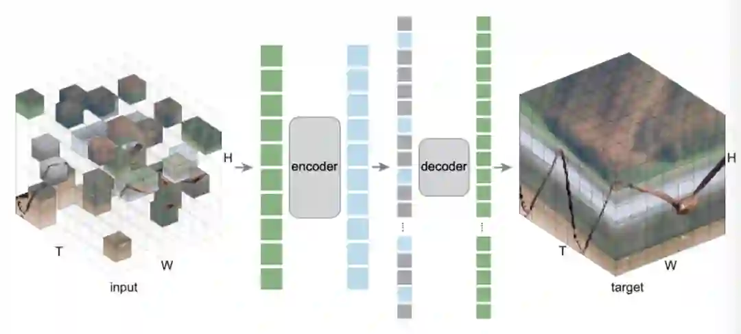 遵循这一理念,作者研究将MAE扩展到时空表征学习问题。本文的方法很简单:作者随机屏蔽视频中的时空patch,并学习自动编码器来重建它们(如上图)。本文的方法具有最小的领域知识:唯一的时空特异归纳偏差是embedding patch及其位置;所有其他组件对问题的时空性质都是不可知的。