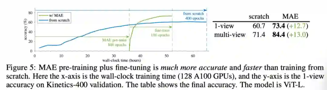 除了精度增益外,MAE预训练还可以降低总体训练成本,800 epoch MAE预训练仅需35.8小时。由于预训练,需要16.3小时的短时间微调,可以获得良好的精度。总体训练时间可以比从头开始的训练更短。这表明MAE是一种实用的视频识别解决方案。