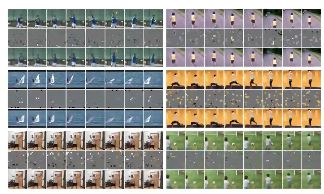MAE中假设最佳掩蔽率与数据的信息冗余相关。对于非结构化随机掩蔽,BERT对语言使用了15%的掩蔽率,而MAE对图像使用了75%的掩蔽率,这表明图像比语言有更多的信息冗余。本文对视频的实证结果支持这一假设。作者观察到视频的最佳掩蔽率为90%。这符合通常的假设,即由于时间相干性,自然视频比图像具有更多的信息冗余。下图显示了本文方法在掩蔽率为90%和95%的未知验证数据上的MAE重建结果。