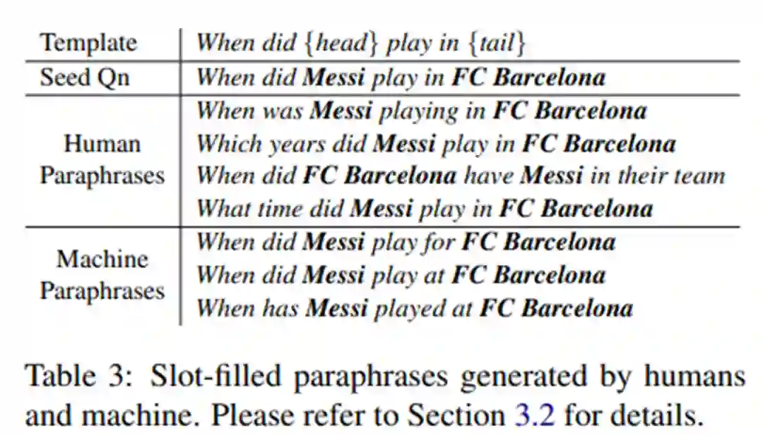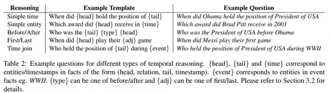 CRONQUESTIONS包含两个部分:包含时间标注的知识图谱和需要时间推理的问答集。在构建知识图谱时,作者首先从WikiData中选取了包含时间标注的关系,并剔除了占比超过50%的关系的部分数据用以平衡数据分布。与此同时,为了避免图谱丢失一些重要的事件信息,作者从WikiData中抽取了重要的包含起始时间的实体,并将这些实体信息添加到了知识图谱中,例如World War II, 作者添加了以下格式(WWII, significant event, occurred, 1939, 1945)的事实。在构建问答数据集时,作者基于出现次数最多的关系构建了一系列的问题模板(图2)。基于这些模板,在人工改写的问题基础上,同时使用了模型去生成更多的问题,最终构建了410k的数据。