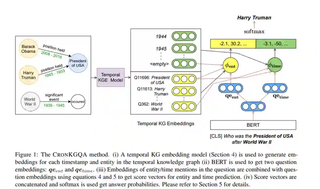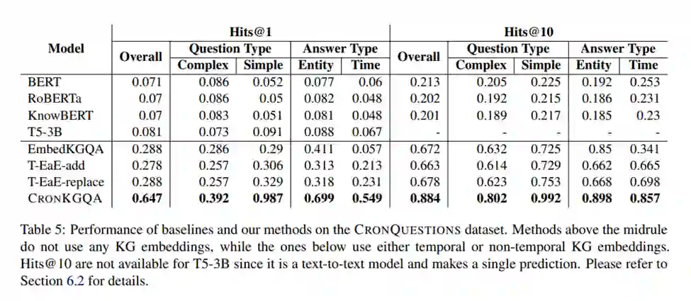 为此,作者在这篇工作中提出了一个新的Temporal KGQA的数据集----CRONQUESTIONS。在构建数据集时,作者遵循了以下三个原则,1.相关KG必须提供时间标注。2.问题必须涉及时间因素推理。3.标记实例的数量必须很大,足以用于训练模型。基于此,作者最终推出了包含125k个实体和328k个事实的时序知识图谱和410k个需要进行时间推理的自然语言问题。作者验证了语言模型T5,BERT,KnowBERT以及LM+KG的模型Entities-as-Experts 和 EmbedKGQA的实验结果,在数据集上的表现并不令人满意。作者提出了CRONKGQA模型,在任务中取得了不错的结果。