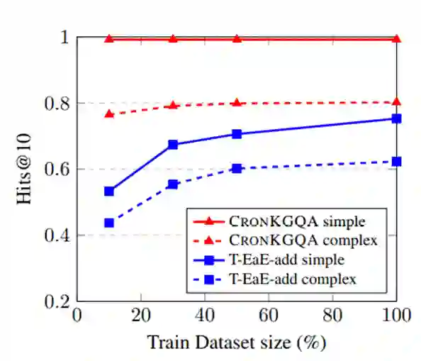 作者同时也比较了训练数据集大小对模型结果的影响。我们可以看到除了CRONKGQA在简单的推理数据上的表现,随着训练集的增大,模型的效果会更好,这验证了作者之前的假设:拥有一个大的(即使是合成的)数据集对于训练时态推理模型非常有用。