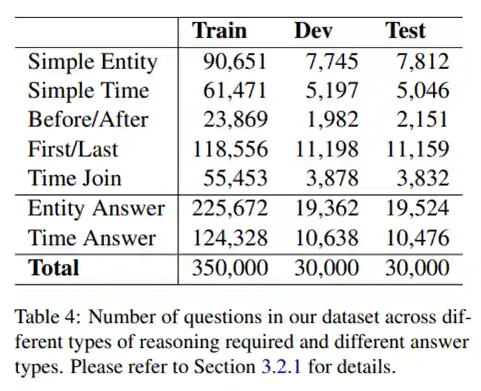 然而,目前关于时序知识图谱问答任务的数据集的研究非常少,从图1中,我们可以看到大部分的KGQA数据集中,知识图谱都不包含时序的关系,数据集中的问题也很少关注时间,TempQuestions数据集关注时序问答的问题,但数据量很少,仅仅用于对模型的测试。